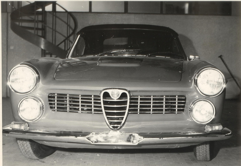 Giovanni Bianchi Anderloni: Der Vertrag zwischen Alfa Romeo und Touring hatte eine stilistische Kontinuität der Fahrzeuge festgeschrieben, vor allem die Front musste sofort wieder erkennbar sein. Aus Kostengründen war allerdings auch festgelegt, dass die wichtigsten Blechteile, also Seiten, Türen und zum Beispiel die Windschutzscheibe gleich bleiben mussten. Der 2600 Spider konnte also nur eine Evolution sein und kein neues Auto. Mal abgesehen von der Aufhängung für den größeren 2600er Motor blieb die Plattform also genau gleich. Entgegen der landläufigen Meinung kamen die Weiterentwicklungen an der Karosse nicht plötzlich. Das permanente Bemühen meines Vaters und seiner Ingenieure führten zuerst zu einer Zwischenlösung (siehe Fotos rechts). Mein Vater und seine Designer waren aber von diesem Entwurf offenbar selbst nicht überzeugt und deshalb verschwand er in der Versenkung – dieser Protyp existiert leider nicht mehr.
