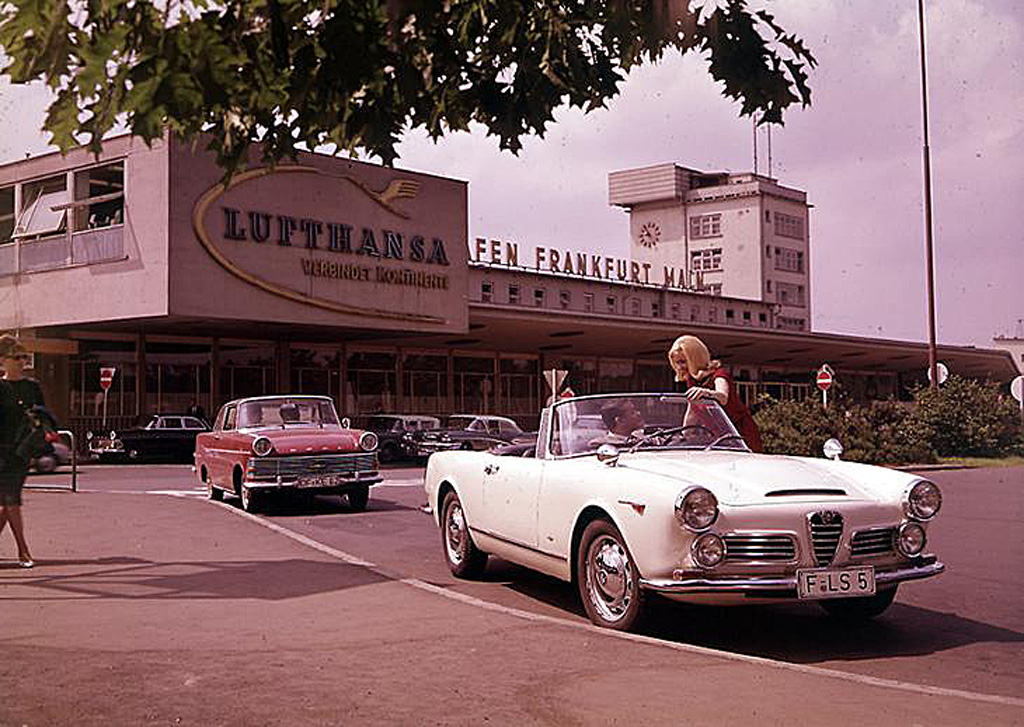Wer sich in den sechziger Jahren eine Flugreise leisten konnte, der fuhr auch den exklusiven Alfa Romeo 2600 - hier ein Werbefoto vom Frankfurter Flughafen.