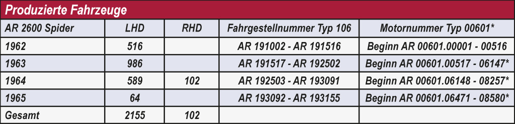 Von Verkäufern werden heute häufig 2600 Spider mit dem Prädikat „matching numbers“ angeboten, doch das ist nicht zulässig. Denn Alfa hat zu den ausgelieferten Fahrzeugen keine Motornummern ausgewiesen. Die dicke Kladde mit allen produzieren 2600 Spider hat keinerlei Eintrag dazu. Im Interview erklärte uns Touring Erbe Giovanni Bianchi Anderloni, dass Touring wohl Unterlagen zu den Motornummern gehabt hätte, diese seien jedoch leider nach dem Konkurs des Unternehmens im Jahr 1966 vernichtet worden. Im Klartext: Wir wissen heute nicht genau, welche Motornummer in welchem Fahrzeug eingebaut wurde. Es existieren im Centro Documentazione von Alfa nur noch Unterlagen darüber, welche Motornummern in welchem Jahr hergestellt wurden. Wer also heute einen Alfa 2600 Spider aus dem Jahr 1962 besitzt, sollte eine Motornummer zwischen 00001 und 00516 haben. Aber so ganz sicher ist das auch nicht. Für die folgenden Jahre sind die Motornummern allerdings noch schwerer zuzuordnen. Denn hier wurden die produzierten Motoren auf die 2600 Spider und Sprint verteilt, so dass man nicht weiß, welche Motornummer in welchem Fahrzeugtyp eingebaut wurde.