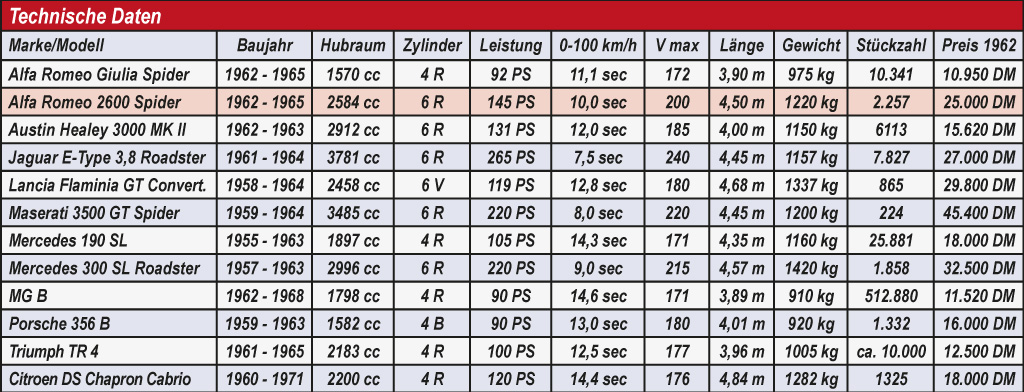 Heute werden jedoch sehr gut restaurierte Fahrzeuge kaum unter 160.000 Euro angeboten, seltene Spitzenexemplare werden auch deutlich über 200.000 Euro gehandelt. Natürlich wird die Zielgruppe in diesen luftigen Höhen ziemlich klein, aber auf jeden Fall lohnt sich eine Restaurierung, wenn man noch ein Basisfahrzeug für etwa 30.000 bis 50.000 Euro erwischt. Die Kaufargumente für einen Alfa 2600 Spider liegen klar auf der Hand und lässt sich am Vergleich mit anderen klassischen Cabrios der 60er Jahre ablesen: Betörendes Design, Seltenheit, Exklusivität, grandioser Motor, hohe Leistung, ansprechende Fahreigenschaften, viel Platz, großer Kofferaum und damit auch eine gewisse Familientauglichkeit.